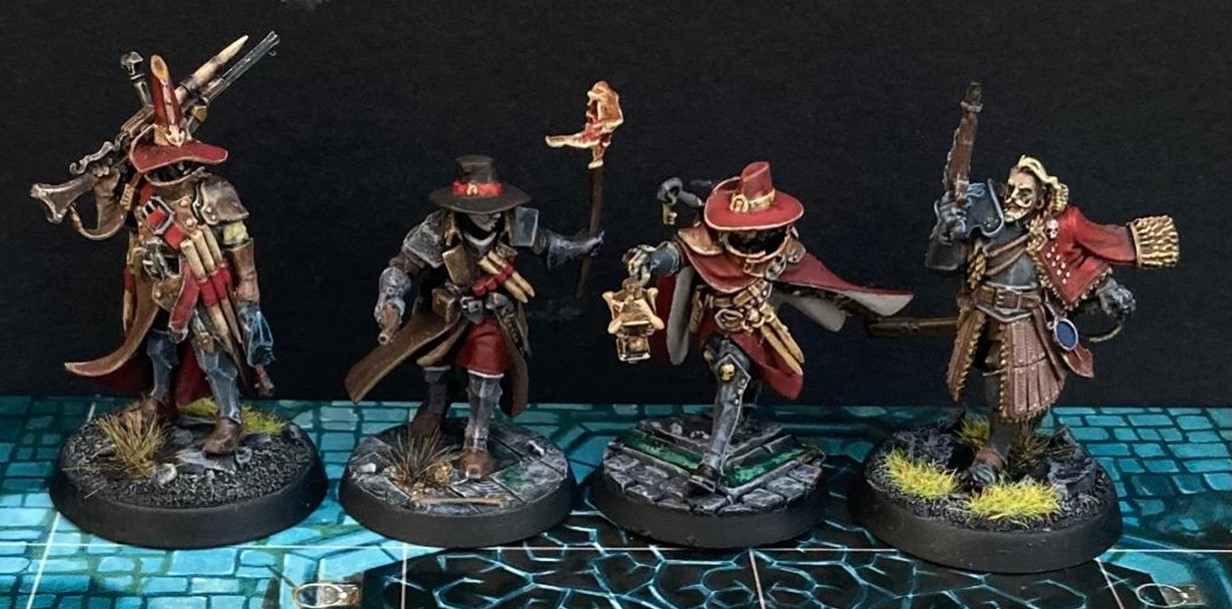 The Witch Hunter theme of Cursed City is one of my favourites in dungeon crawling, and so i had set about adding a four man team to play within the game. From left to right below i have Jelsen Darrock, Haskel Hexbane, Hanniver Toll and Glaurio ven Alten. Futher additions could be to add Galen and Doralia Ven Denst I have a touch of red in my painting theme for the group.